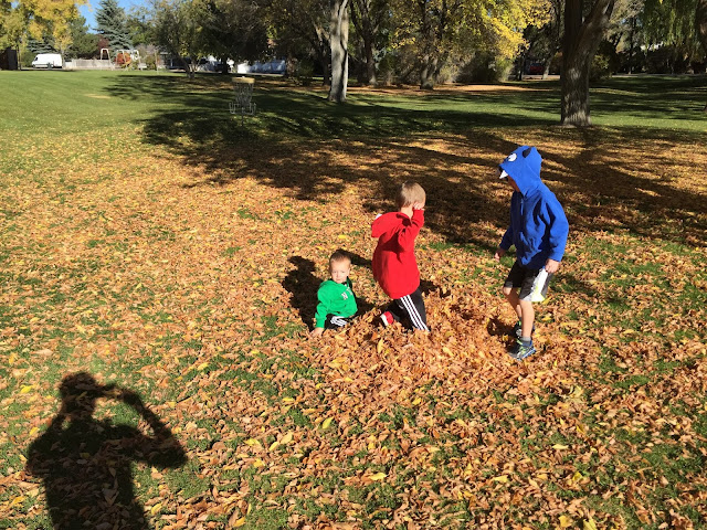 Our sad little tree in our front yard had about 100 leaves (a 100% improvement from last year.), so I was happy to go to Freeman Park and find that they hadn't cleaned theirs up yet. I wish I had brought a rake, but we made do with our hands and feet.